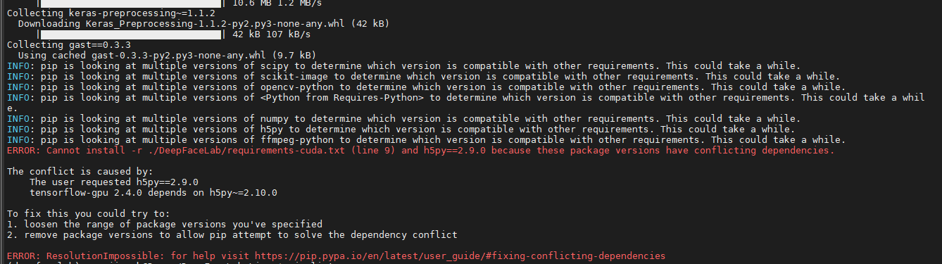 Cannot install -r ./DeepFaceLab/requirements-cuda.txt and h5py==2.9.0 because these package versions have conflicting dependencies.