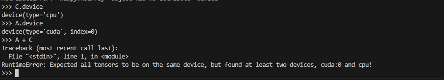 그러나 tensor 연산 시 두 텐서가 data type이 다르거나 로드되어있는 디바이스가 다르면 연산이 진행되지 않는다